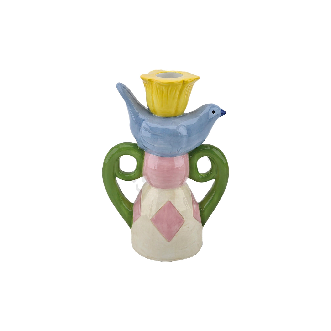 Breng een speelse en artistieke touch in huis met deze blauwe vogel kandelaar van keramiek. De combinatie van zachte pastelkleuren en de poëtische vorm maakt deze kandelaar een echte blikvanger in elk interieur. Perfect voor liefhebbers van een eclectische, botanische of jungle-stijl woonomgeving.