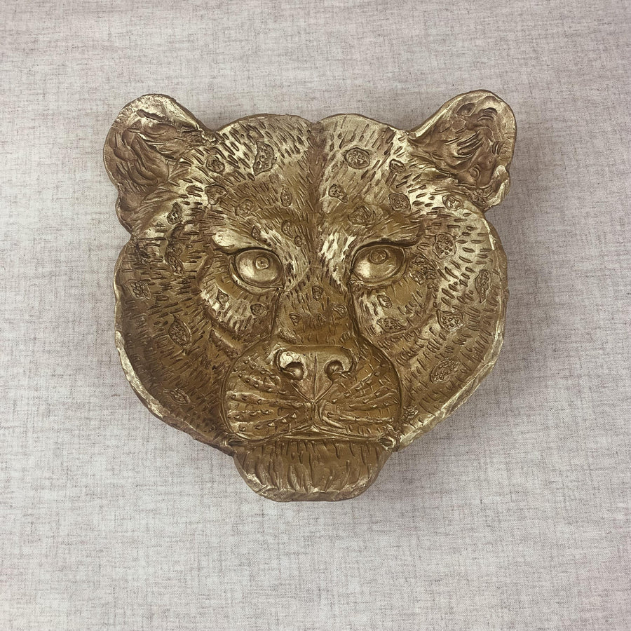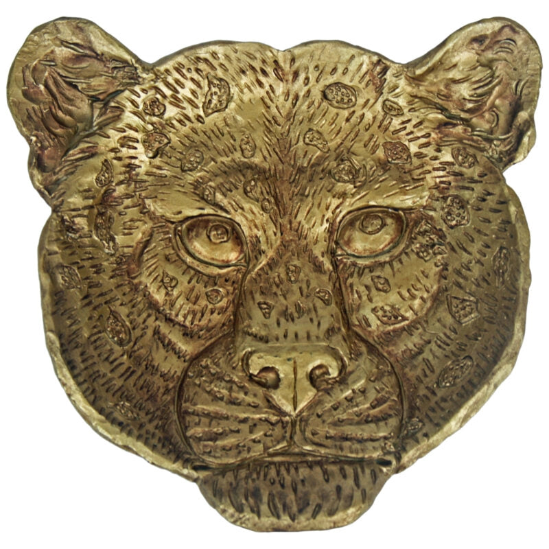 Breng een vleugje exotische luxe in huis met deze indrukwekkende luipaard schaal. De schaal is vormgegeven als een gedetailleerd luipaardhoofd en uitgevoerd in een warme goudkleurige afwerking, waardoor het een echte eyecatcher is op tafel, dressoir of wandkast.